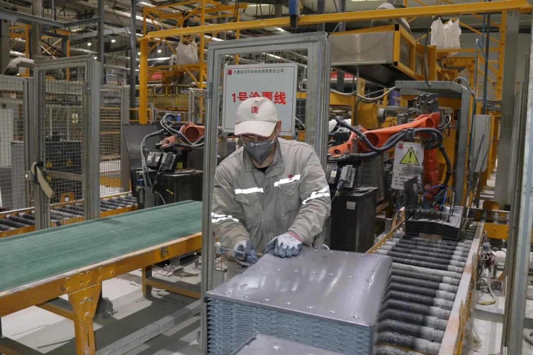 作为中国大唐的环保企业,大唐南京环保建有每年30000立方米平板式脱硝催化剂生产线和每年10000立方米脱硝催化剂再生产线。一台台巨大的橘色“板件机器”像一只“大手臂”,不停抓取板件“奋力工作”,大唐南京环保自主可控的自动化产线、产品都源自这里。