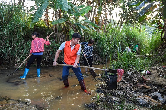 2020年5月2日,广西兴业县小平山镇金华村驻村第一书记董积有(左二)与村民一起清理河道中的淤泥和垃圾。新华社记者 曹祎铭 摄
