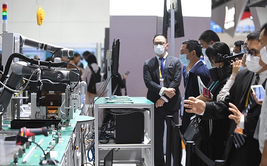 2020年11月6日,在进博会技术装备展区,人们在西门子展台观看人机协作的智能化单元生产线。新华社记者 李任滋 摄