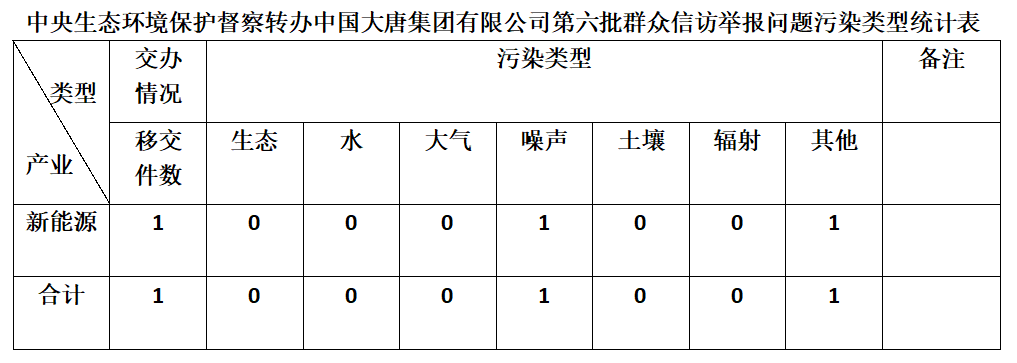 2025年6月9日,中央第七生态环境保护督察组向中国大唐集团有限公司移交第六批群众信访举报件,共计1件,为来电举报,涉及噪声问题1个、其他问题1个。所有举报件办理工作已第一时间进入调查核实办理程序,办理情况将按照相关要求反馈督察组,并及时向社会公开。