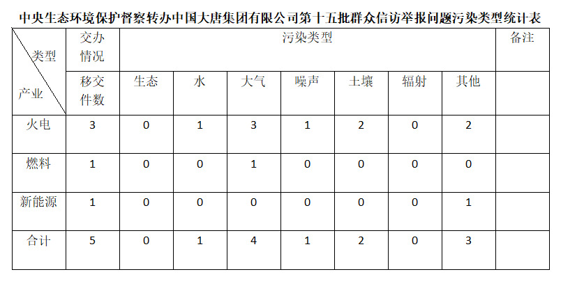 2025年6月21日,中央第七生态环境保护督察组向中国大唐集团有限公司移交第十五批群众信访举报件,共计5件,其中来信举报3件,来电举报2件,涉及水问题1个、大气问题4个、噪声问题1个、土壤问题2个、其他问题3个。所有举报件办理工作已第一时间进入调查核实办理程序,办理情况将按照相关要求反馈督察组,并及时向社会公开。