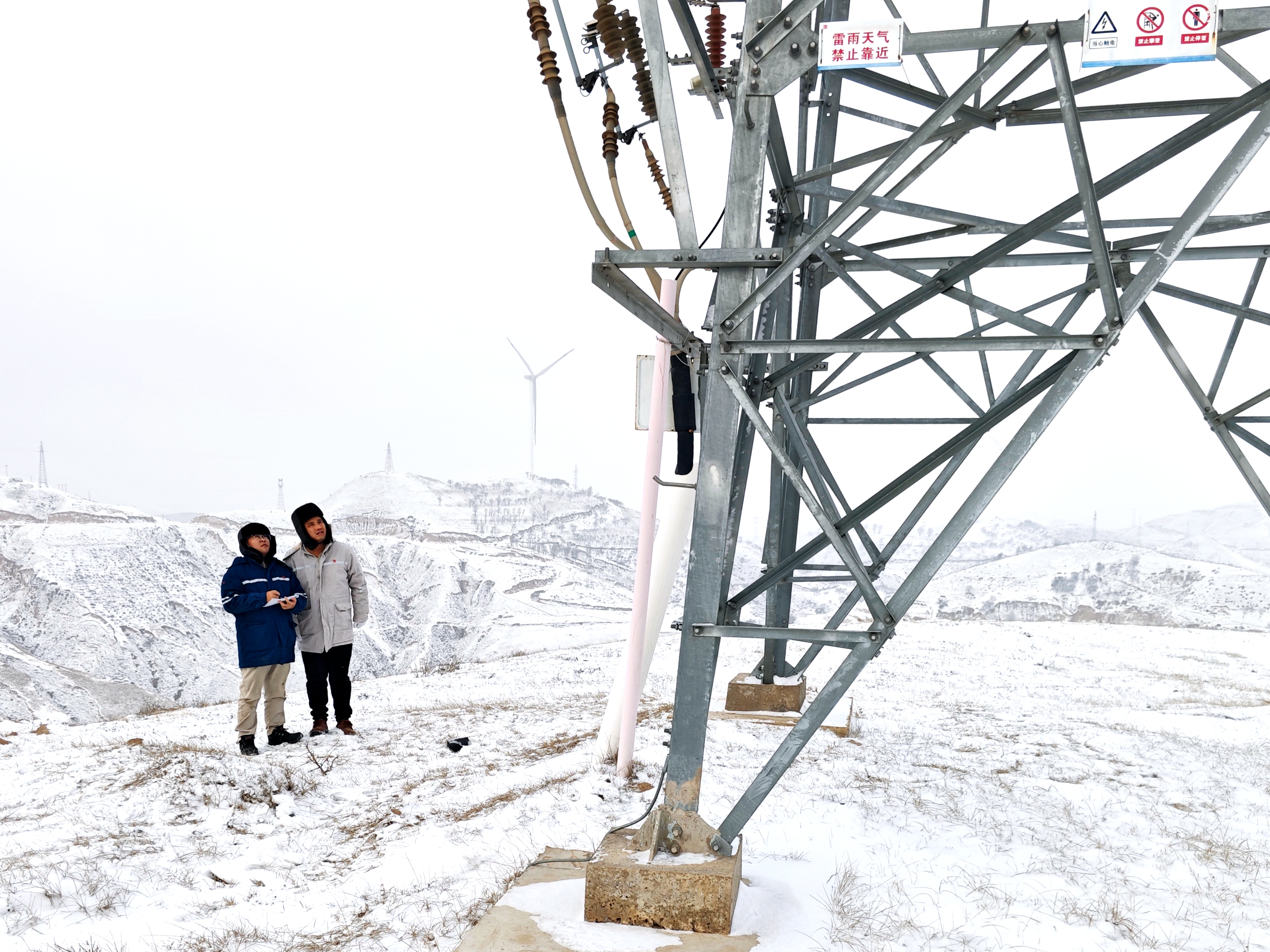 “咱们过去看一下线路,有没有存在积雪或者结冰的现象。”已经从事了五六年工作的李鹏飞,对没有亲眼看到的线路状况很难放下心。他叫上卫哲,抄近路往山上爬。半个多小时后,他们爬到距离35千伏集电线路最近的观察区,两人脸庞冻得红彤彤,额头上却冒起汗珠,棉服被汗水浸透。不一会,巡线二人组帽檐上的汗水在寒风刺骨下变成了“冰溜子”。