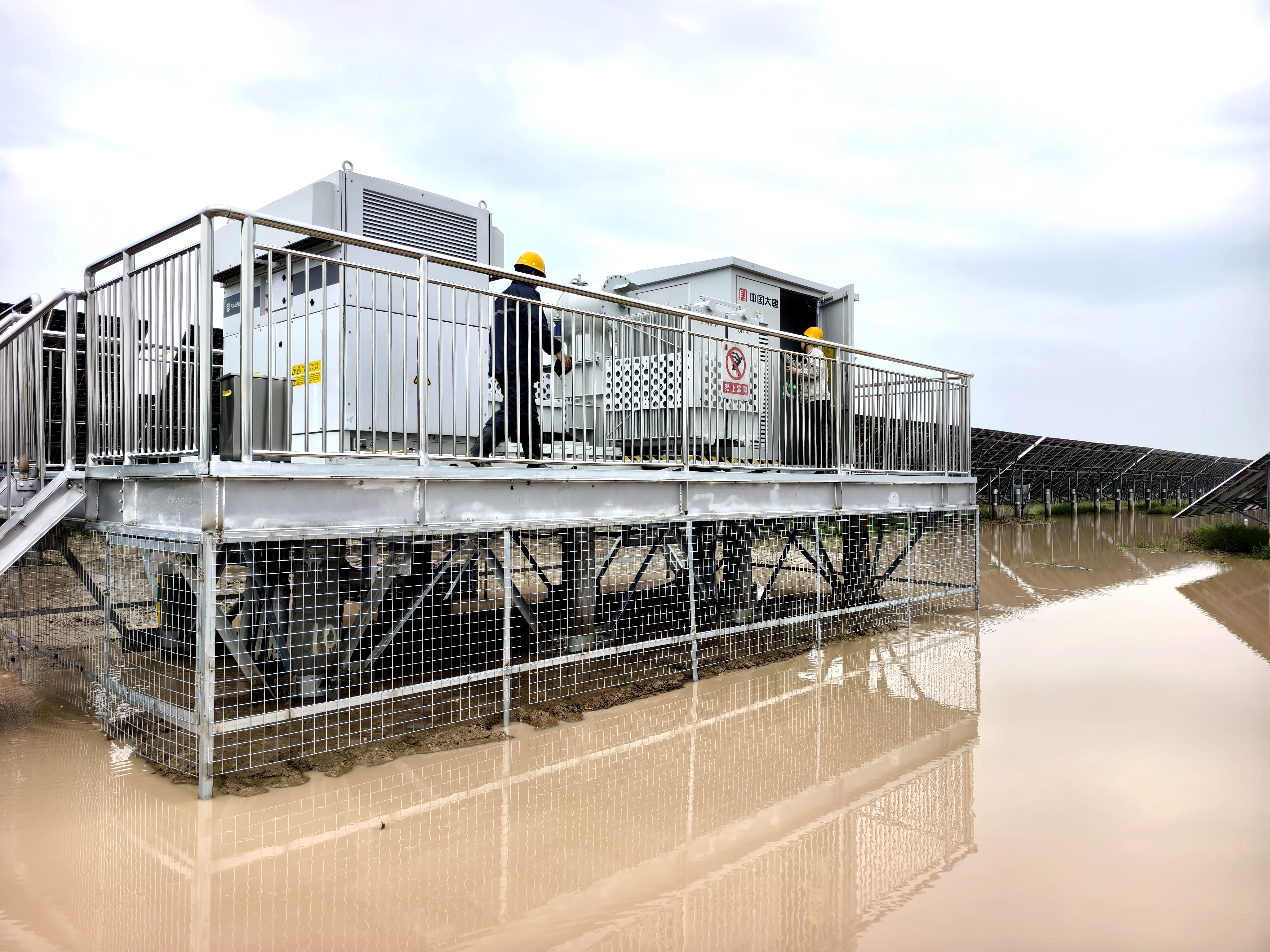 持续的强降雨导致托克托县伍什家镇呼和浩特铝电公司36万千瓦光伏电站厂区积水迅速上涨,部分区域形势严峻。“报告赵组长!二标段集电电路7方阵86号汇流箱处积水深度已超警戒线,部分汇流箱基础被淹!”对讲机里传来运行值班员焦急的声音。险情就是命令!该公司新能源工程组组长赵大虎果断下令:“立即启动防汛一级应急预案!所有人员,进入战时状态!”