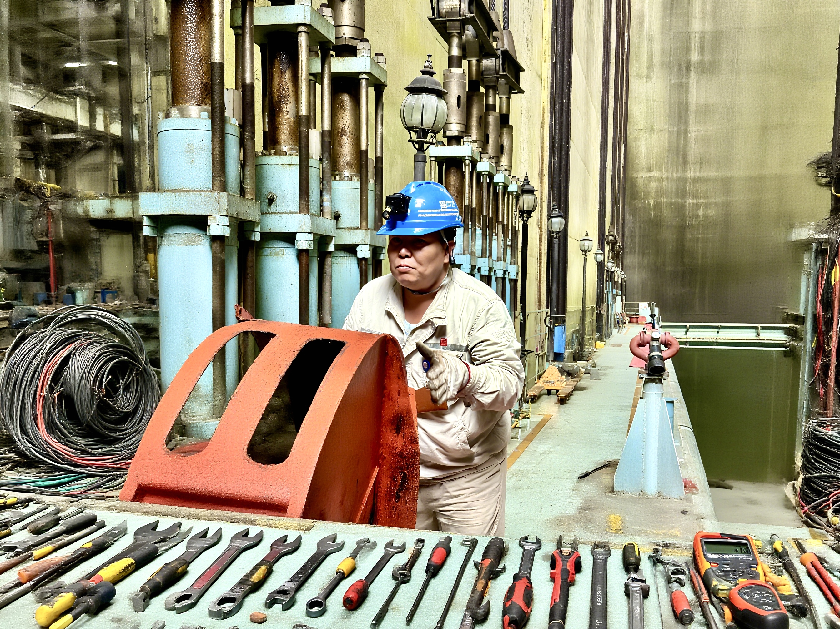 暮色漫进升船机的间隙时,工具的归位声在廊道间清脆回响。樊师傅用老棉布最后擦拭扳手,镀铬层磨出了岁月的哑光,却不见半点锈迹。工具车入库时,所有工具都在各自的位置上发出轻微的共鸣,就像完成了一场无声的合奏。