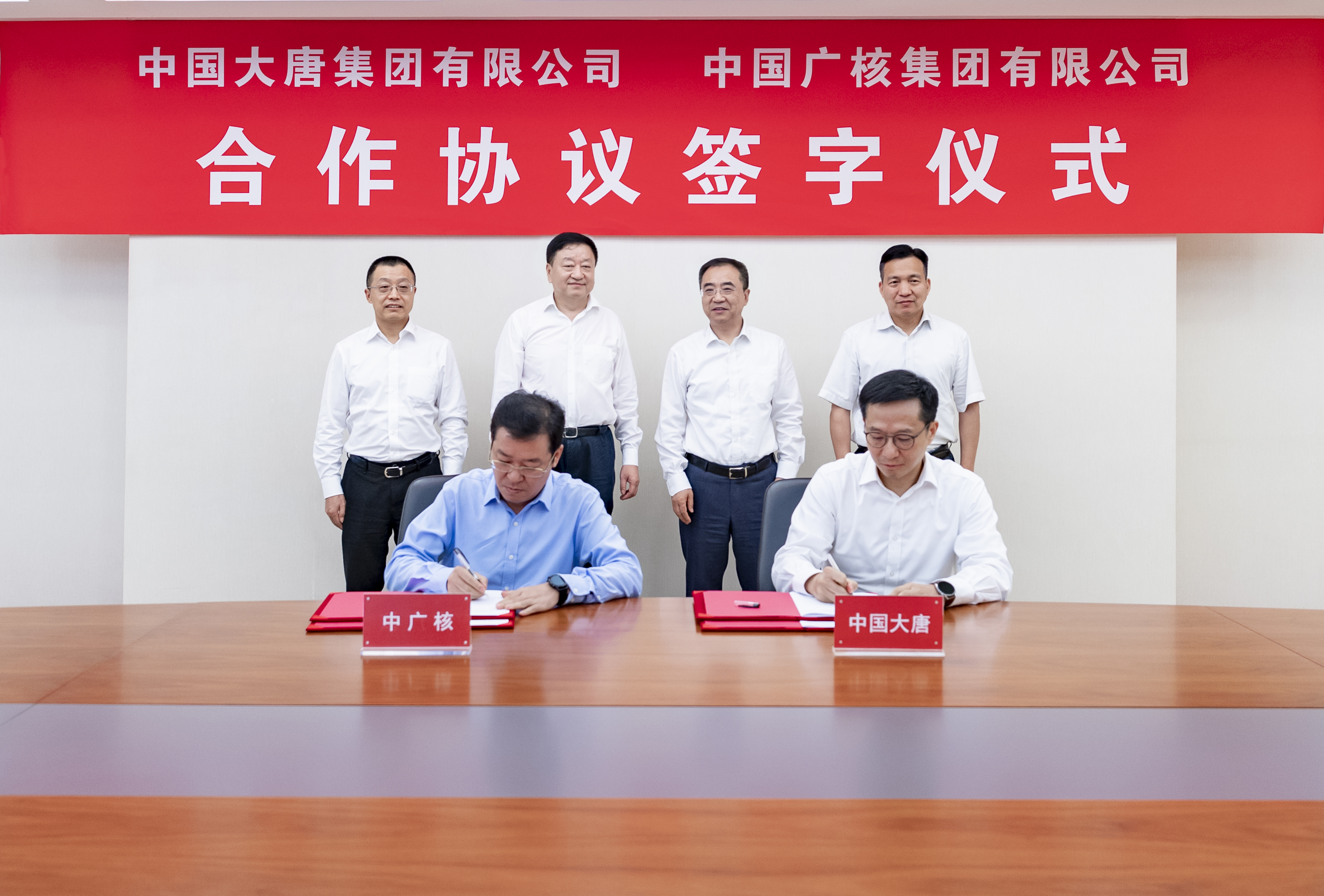 中国大唐党组成员、副总经理彭勇,中广核集团党委常委、副总经理庞松涛参加会见并代表双方签署合作协议。